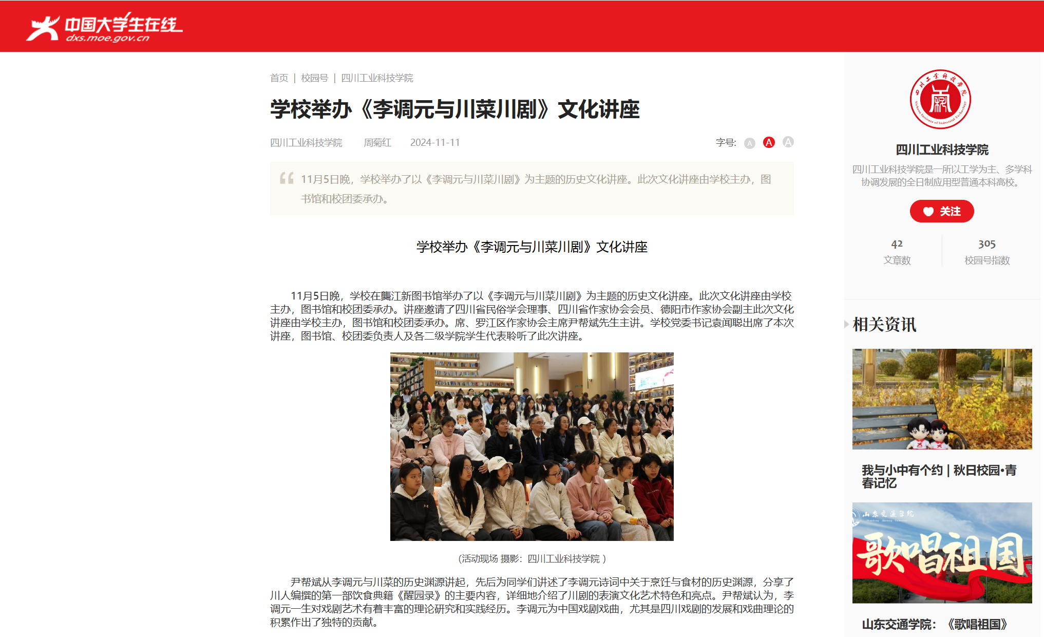 【中国大学生在线】学校举办《李调元与川菜川剧》文化讲座
