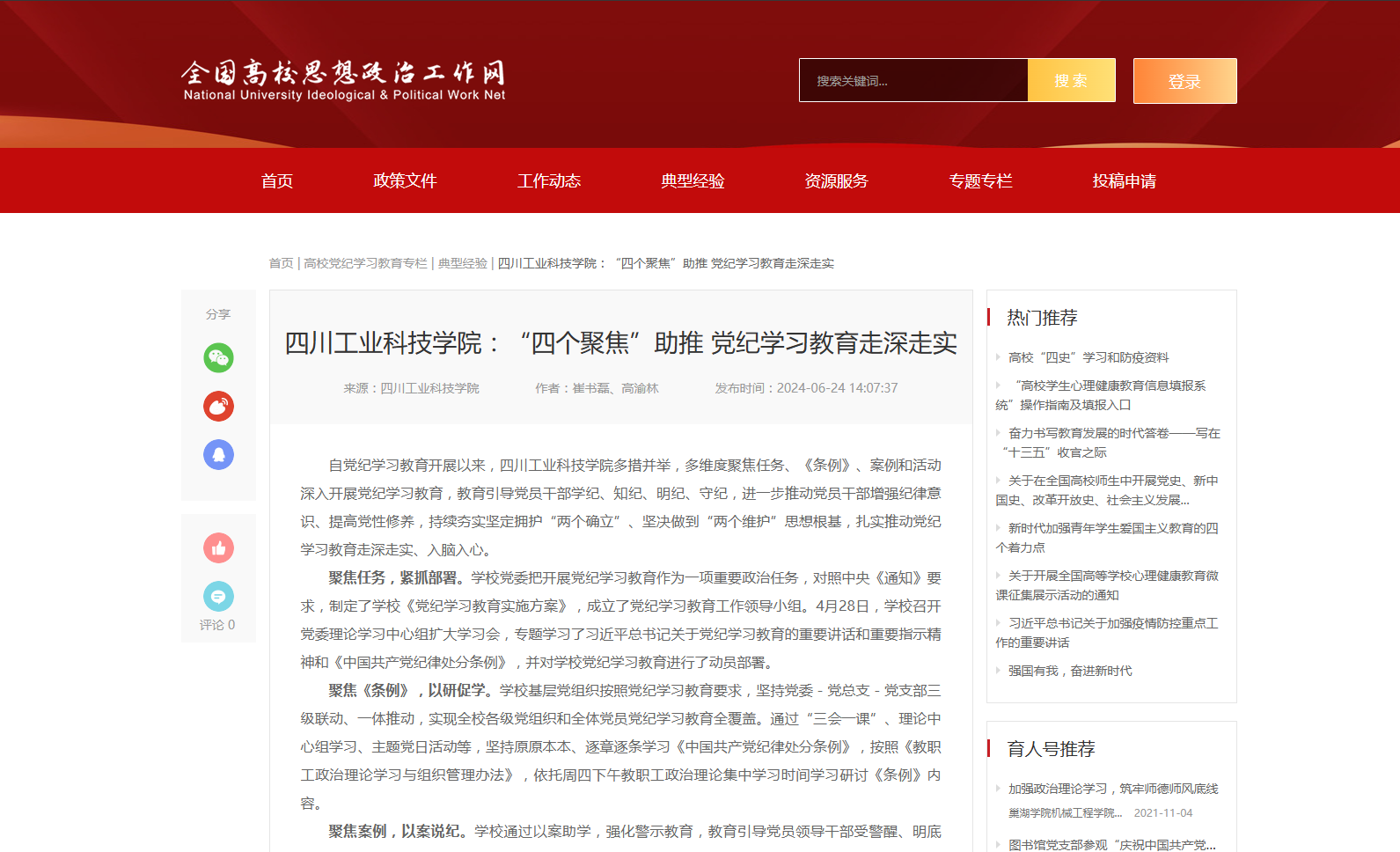 聚焦活动,真学实干。学校依托易班优课平台开展“学纪 知纪 明纪 守纪”党纪知识竞赛,1600余名学生党员、预备党员、入党积极分子参与活动。组织开展“廉洁铸魂强根本 挺膺奋进建新功”“清音传廉 清风育廉”作品征集活动,引导学校师生通过图文、视频等形式创作廉洁教育网络文化作品。学校党委宣传部依托官网党纪学习教育专栏,微信公众号一周一学栏目,积极宣传党纪学习教育的重大意义、目标要求和重点任务,使党纪学习教育入脑入心。