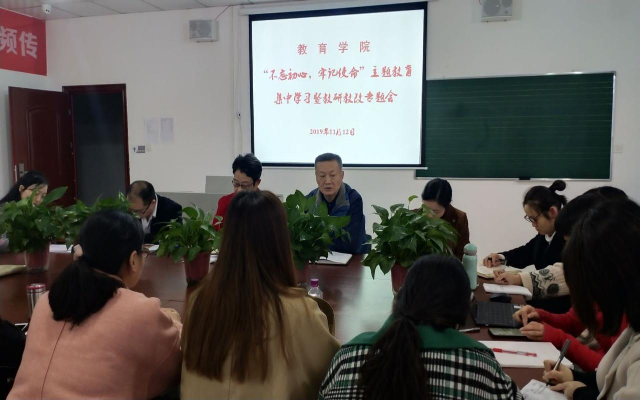 最后,副校长郭桂萍结合学校主题教育工作安排,结合教育教学工作实际,对教育学院教研教改工作给予了全面、详尽、具体的指导,要求教师们要从以下几个方面加强学习,提高工作水平:一是高度重视教师教书育人的工作职责,增强责任感,珍惜难得的工作机会,切实将主题教育与本职工作融合起来;二是要加强对本科教育大会、全国教育大会等重要教育会议的学习,认真领悟“以本为本”、“四个回归”等重要的教育精神,用以指导自己的课堂教学、科学研究工作,争取使自己的教学效果达到“教师讲、学生忙、课堂活、毕业难”这一标准;三要从人才培养方案修订、完善教学实践体系、制定课程主辅修制度、建立三级专业认证体系等途径提升专业建设水平;四要通过打造五大金课、融合思想政治教育、创新创业教育和专业知识教育为一体的综合性课程内容,提升课程建设水平。