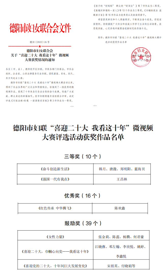 近日,德阳市妇女联合会发布《关于“喜迎二十大 我看这十年”微视频大赛获奖情况的通知》,学校师生创作的《奋斗创造新生活》《强国一代有我在》等6个作品在比赛中喜获佳绩。