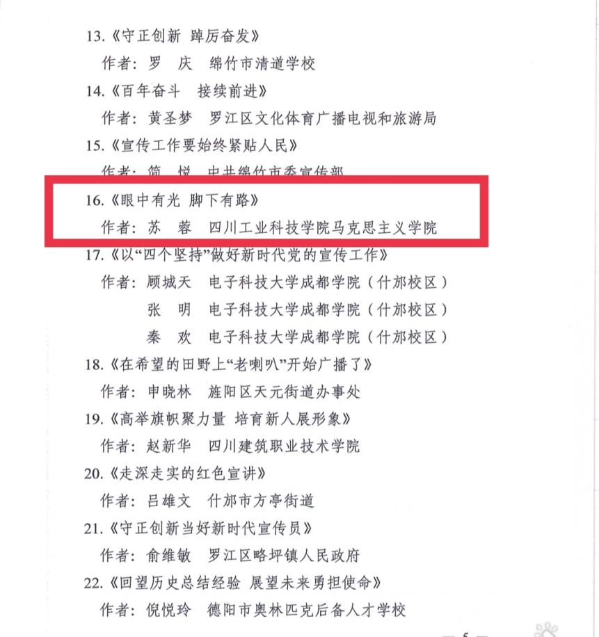 眼中有光,脚下有路。作为高校思想政治教育工作的主阵地,学院教师一直以高度的政治责任感和强烈的历史使命感,做好新时代宣传思想工作,今后将进一步组织和鼓励教师申报课题,多出研究成果,为现代化德阳建设贡献智慧和力量。