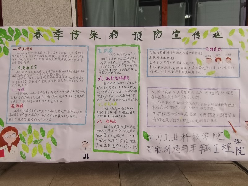 为切实保障全体师生的身体健康,营建安全稳定的教学环境,学生工作部(处)主动强化学生安全工作职责,严格对标省、市、区关于做好学校传染病防控工作的系列通知要求,坚持防控关口前移,联动各二级学院,通过开展春季传染病预防主题班会、发放诺如病毒防控知识手册、制作春季传染病防治宣传展板等喜闻乐见的方式,向学校师生宣传诺如病毒、流行性感冒、水痘、手足口病等八种学校重点传染病防控知识,全方位、多角度提升学生防护意识与能力,认真落实好“四早要求”,确保将各类病菌毒传播扼杀在萌芽状态,纵推平安校园建设。