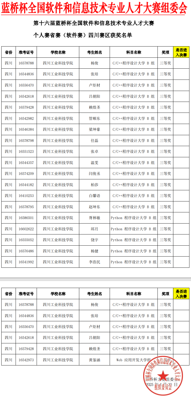 近日,第十六届蓝桥杯全国软件和信息技术专业人才大赛软件赛省赛获奖名单正式公示,电子信息与计算机工程学院学子凭借出色表现,在本次大赛中取得优异成绩,荣获一等奖2项、二等奖14项、三等奖20项,共计35项奖项,刷新了学院在该赛事中的历史最好成绩,充分展现了学院在软件与信息技术领域人才培养的卓越成果。荣获一等奖的学生将继续参加国赛决赛。