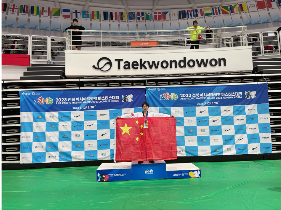 2023全北亚太地区大师运动会日前于韩国全罗北道全州市闭幕,中国队选手在历时九天的比赛中摘下41枚金牌、121枚奖牌。其中,学校体育与健康学院游拢老师力克劲敌,在跆拳道项目上勇夺1金1银1铜的好成绩,让中国国旗飘扬在国际赛事舞台上。