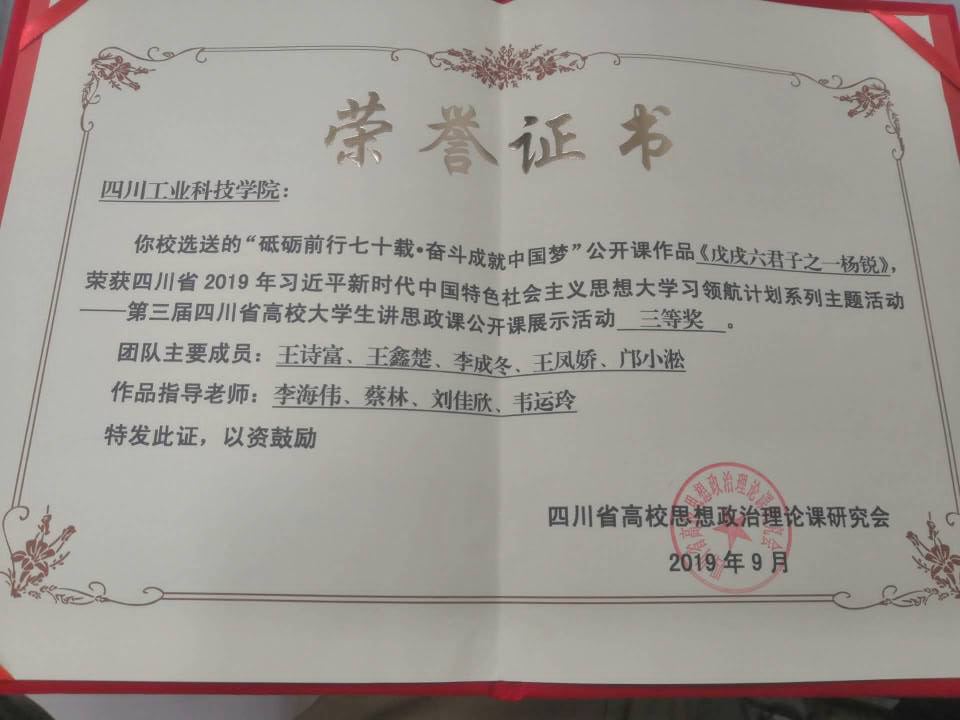 近日,由四川省高校思想政治理论课研究会举办的四川省2019年习近平新时代中国特色社会主义思想大学习领航计划系列主题活动——第三届四川省高校大学生讲思政课公开课展示活动圆满落幕。