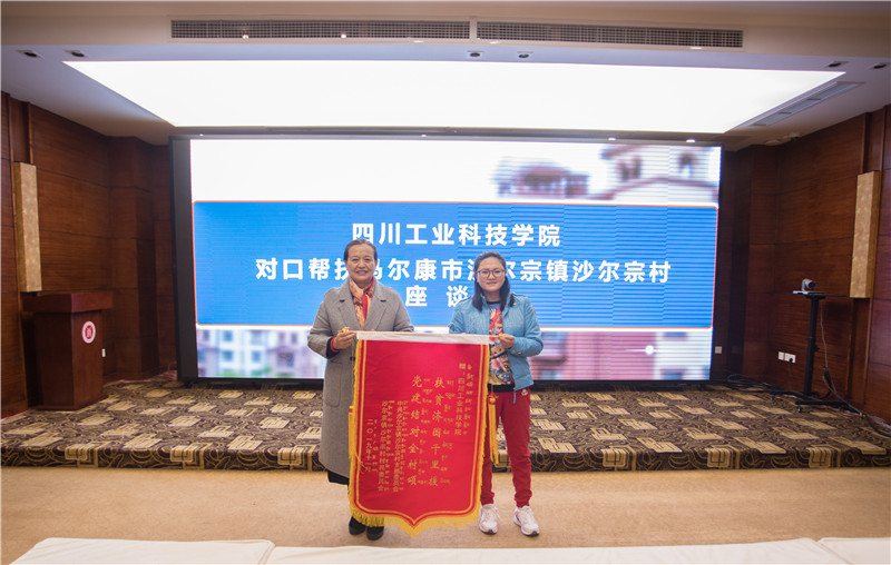 座谈会上村委会主任祝昌海代表沙尔宗村对学校长期以来给予沙尔宗村的无私援助表示了由衷的感谢,并希望在接下来的扶贫工作中,学校能给予更多的技术和人才支持,助力沙尔宗村与全国人民同步迈入小康。同时,沙尔宗村第一书记哈斯曼代表沙尔宗村向我校赠送了锦旗和哈达。