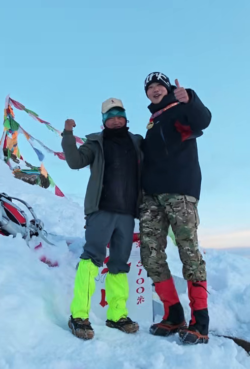 “此次攀登,既是为了提升专业实践能力,也是为了承载全校师生的心愿。”曾志磊在自述中说道。作为一名深耕专业的体育学子,他此次登顶有着明确的专业追求——考取5000米雪山攀登证明,为后续备战高山协作向导证打下基础。攀登之路,远比想象中艰难。此次登山全程累计爬升2000余米,曾志磊的征程从海拔2800米的四明村出发,4月17日上午9点启程,穿越葱郁的森林草甸、踏过冰冷的冰雪河流,在高原环境中历经7小时的长途跋涉,于下午4点顺利抵达海拔4200米的大本营,完成了高海拔适应的关键一步。次日凌晨两点,气温一度下降到-9℃,天还未亮,他便与专业向导一同开启冲顶之路。连日大雪让山路积雪深厚,每一步都深陷冰雪之中,加之轻微高原反应带来的不适,行进异常艰难。翻越海拔4900米的垭口后,一段近七十度的“绝望坡”横在眼前,陡峭的坡度、湿滑的雪面,每向上一步都需要付出巨大的努力。