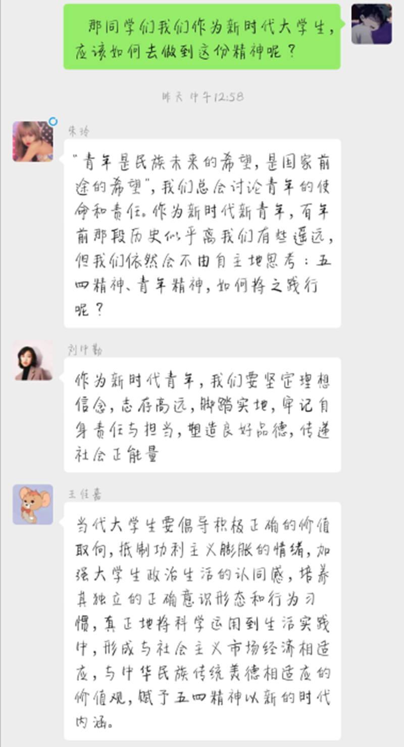 习近平总书记的深情寄语、殷切嘱托,极大鼓舞了广大青年积极拥抱新时代、奋进新时代。总书记的深情寄语、殷切嘱托,极大鼓舞了广大青年积极拥抱新时代、奋进新时代。“青春是用来奋斗的,奋斗本身就是一种幸福。作为新青年的我们,应该树立远大理想,学习新时代爱国思想,努力提升自身文化知识水平和道德素养,弘扬五四精神,担起时代责任。”同学们纷纷表示,要牢记习近平总书记寄语,继承和发扬五四精神,在实现中华民族伟大复兴中国梦的新长征路上奋勇搏击。