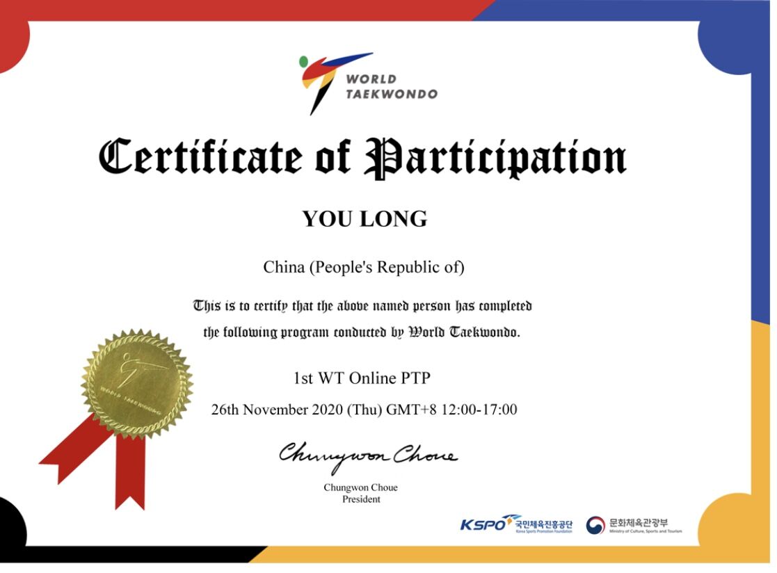 体育学院游拢老师参加WT(世界跆拳道)组织的 国际跆拳道教练员线上培训并取得结业证书