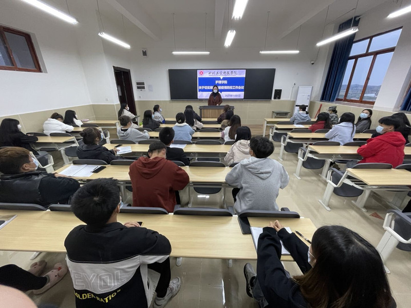 会上,党总支副书记李双晶认真传达了四川省教育系统新型冠状肺炎感染的肺炎疫情防控工作领导小组下发的“六严”“六到位”紧急通知精神、德阳市和学校疫情防控文件会议精神,对学院疫情防控工作提出明确要求。她指出,全体护理学院师生要高度重视当前疫情防控的严峻形势,提高思想认识,落实责任到位。严格执行“日报告、零报告”制度工作,严控师生健康监测,做好缺勤、早退、请假记录。辅导员、专业教师对学生积极开展疫情防控知识教育,指导学生戴好口罩、勤洗手、勤消毒、勤通风,进行科学防控,加强学生思想政治引领,避免不良舆情发生。