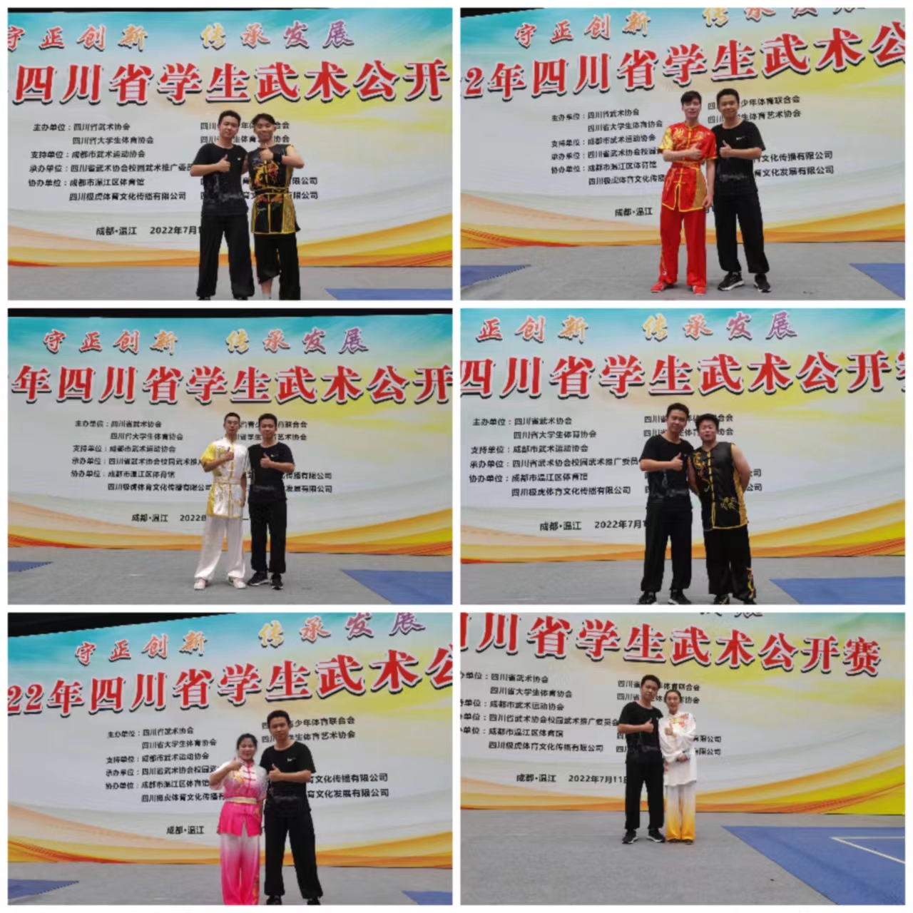 四川省学生武术公开赛于2022年7月11日—13日在温江举行,我校武术队在教练员雷耀方、李青、于淼老师的指导下,经过一个月的集训,7名队员在比赛中成绩突出,获得了5个第一名、2个第二名、2个第三名的好成绩。