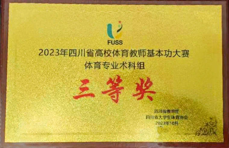 本次比赛设体育专业类、公共体育类、高职高专类共3个类别,其中体育专业类下设学科组、术科组两个组别,评委对教学技能(微课视频)和现场说课两个环节进行评比。比赛竞争激烈,我院青年教师魏晓萍凭借出色的教学设计和精彩的现场竞赛,斩获体育专业术科组“三等奖”,学校获得2023年四川省高校体育教师基本功大赛比赛体育专业术科组团体 “三等奖”。