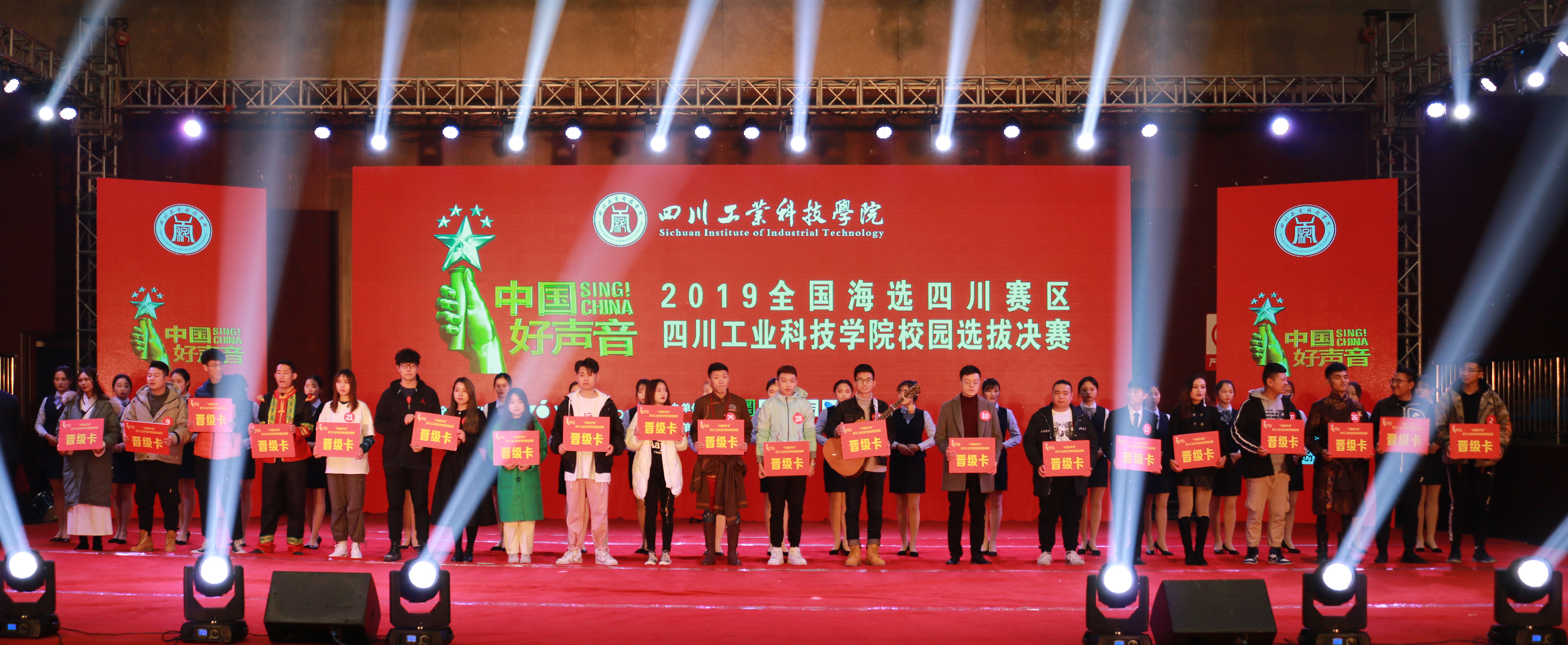 历经层层选拔,来自两大校区各院系的30组选手站到了决赛的舞台上。大赛现场,选手们一展歌喉、大放异彩,可谓一场精彩绝伦的视听盛宴。经过激烈的角逐后,王诗富、罗新莲、哆拼西凑乐队、59号乐队等20组选手冲出重围,顺利晋级。晋级选手将代表四川工业科技学院参加2019年在成都举行的省校园总决赛。