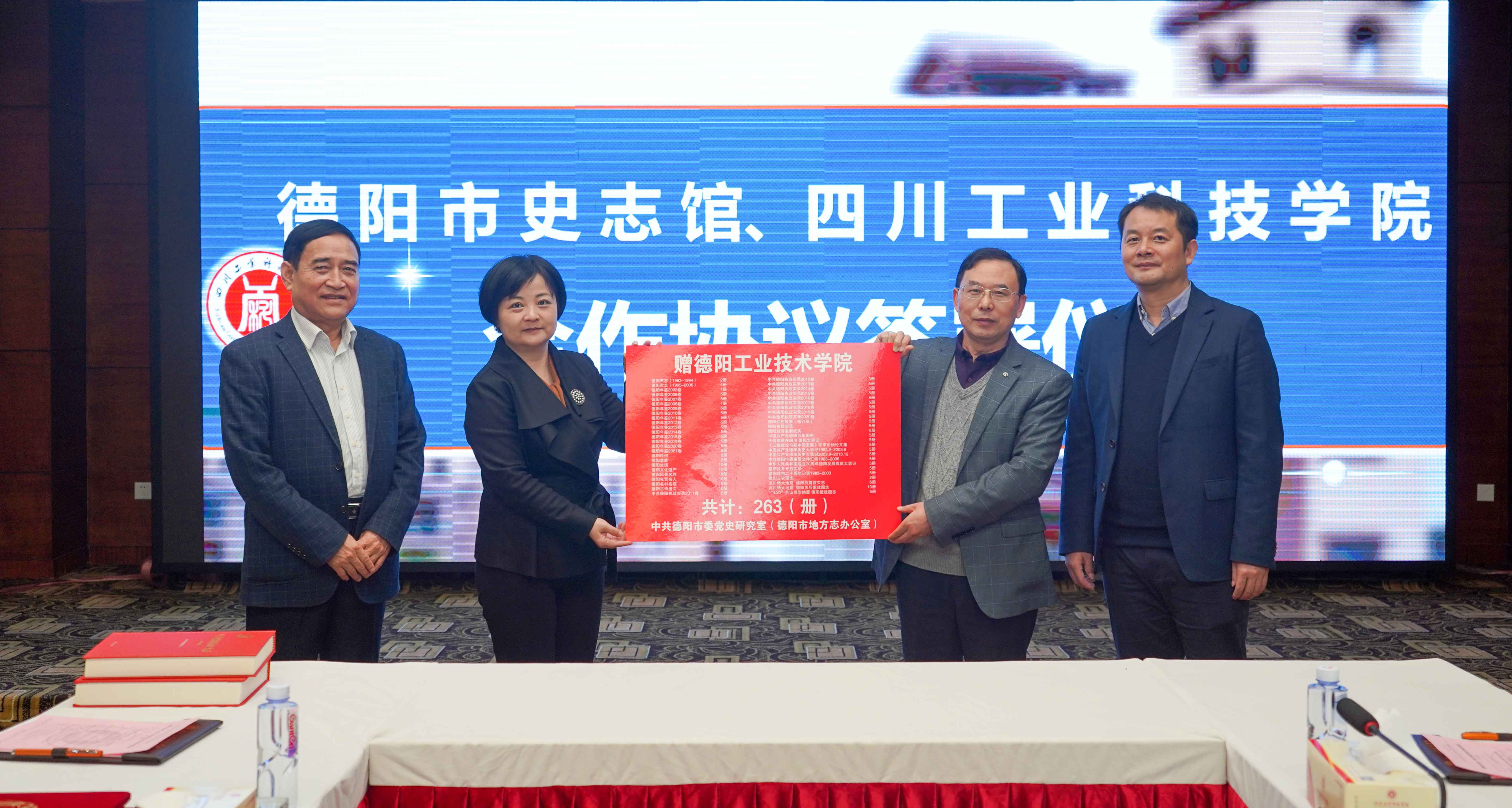 双方签订了合作框架协议。中共德阳市委党史研究室(德阳市地方志办公室)主任杨兆红向学校授予“德阳市史志馆四川工业科技学院分馆”牌匾。杨兆红主任、温剑锋副书记分别代表中共德阳市委党史研究室(德阳市地方志办公室)和罗江区委党史研究室向学校捐赠了志史图书。