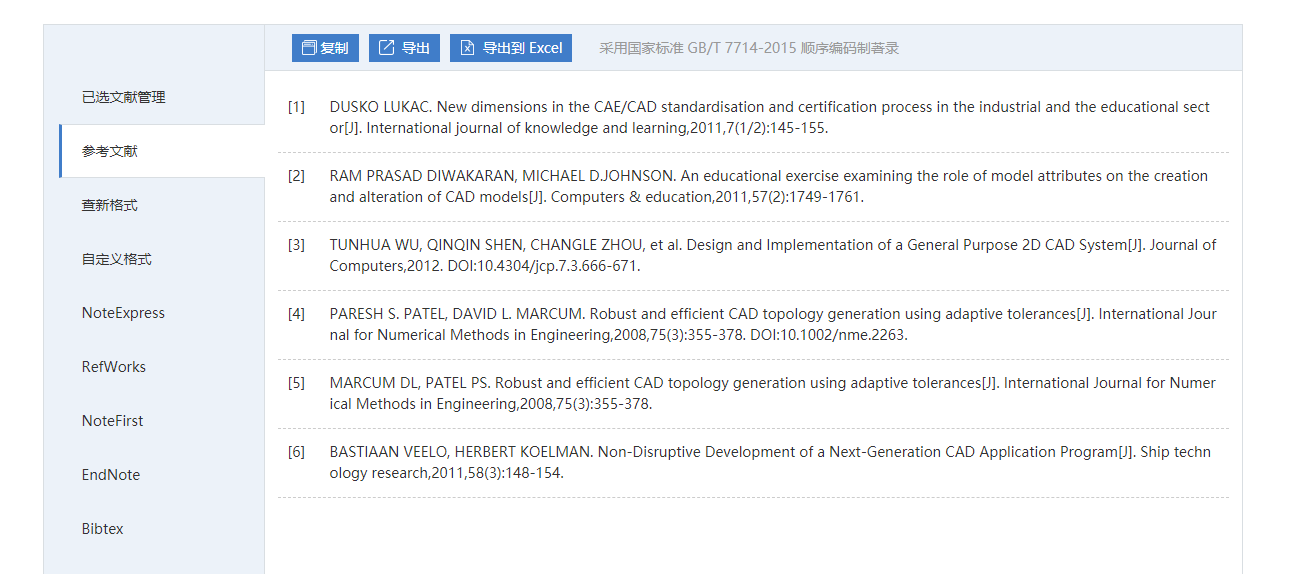 用户点击“导出”按钮,可根据需要导出不同的文献格式。参考文献格式导出支持期刊、学位、会议、科技报告类型的国家著录标准格式、NoteExpress、RefWorks、NoteFirst、Endnote、Bibtex、查新格式的导出。此外,还可根据用户需求灵活实现自定义所需求的字段进行导出