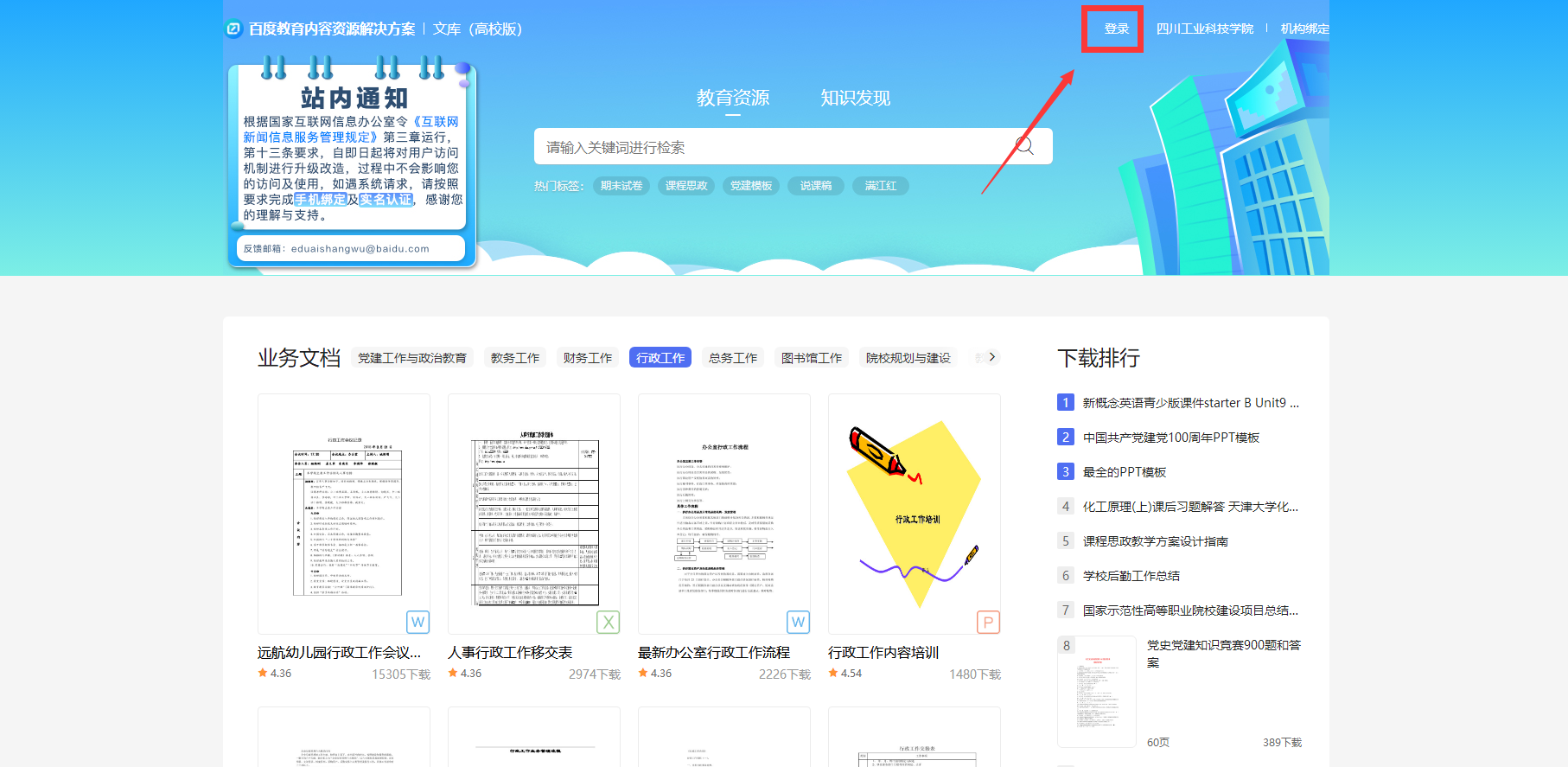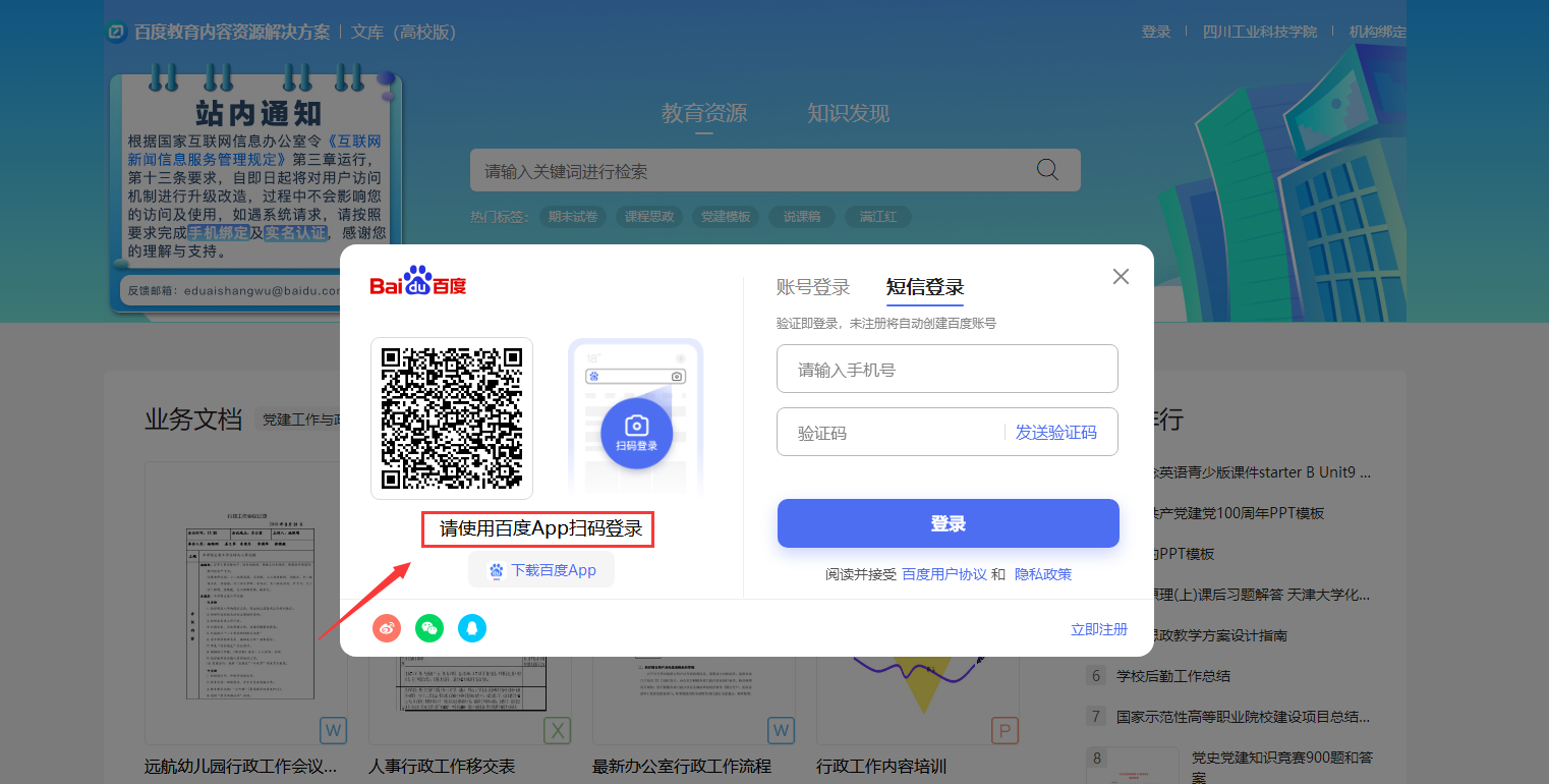 1.在校园网IP范围内打开“百度文库高校版”主页,点右上角“登录”输入账号密码或通过百度app扫码“登录”;如未注册账号点击“短信快捷登录”通过手机验证或“立即注册”进行注册后登录。