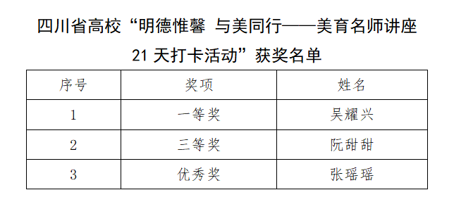 四川省高校“明德惟馨 与美同行——美育名师讲座21天打卡活动”获奖名单
