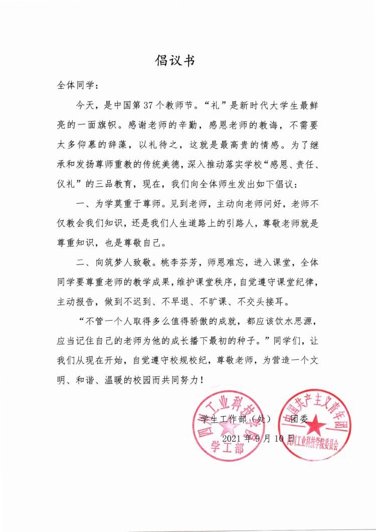 赓续百年初心,担当育人使命 四川工业科技学院第37个教师节倡议书