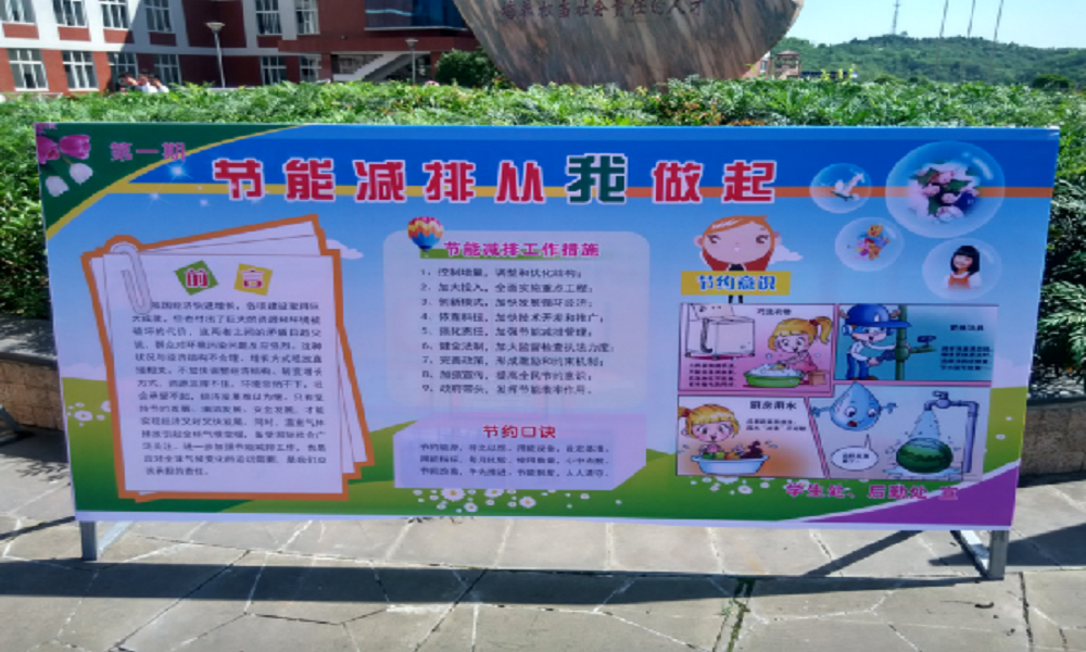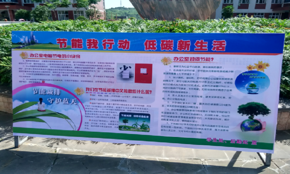 活动开展当天,校团委学生会青志部和生活部的干事们把准备好的宣传板提前摆放在教学楼责任石周围,让同学们能够清晰的了解宣传板上的关于节能减排的信息。然后,大家在教学楼、责任广场、图书馆、实训楼等地点向同学们发放节能减排宣传单,向我校师生宣传节能减排小知识。