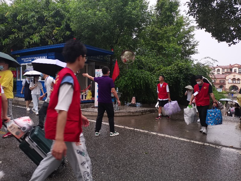 校内新生转运工作持续循环推进,负责校内新生转运的师生挥汗如雨,衣服已被汗水和雨水交融浸透,但他们依旧坚守岗位,用心用情用力为新生报到“最后一公里”保驾护航,全力当好新生平安转运至学生公寓的“摆渡人”。