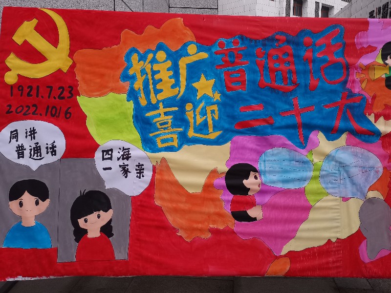 同时,各二级学院对照《学生工作部(处)2022推普周工作计划》,结合学院工作实际,绘制了喜闻乐见的“推广普通话,喜迎二十大”活动展板,并摆放在人流较多的龑江学村图书馆前,积极营造推普活动氛围、提升师生文明意识,形成人人学普通话、人人说普通话的良好语言环境,全面铸牢国家通用语言文字在促进各民族间无障碍交流的桥梁作用以及帮助个人成长成才的基础性作用。
