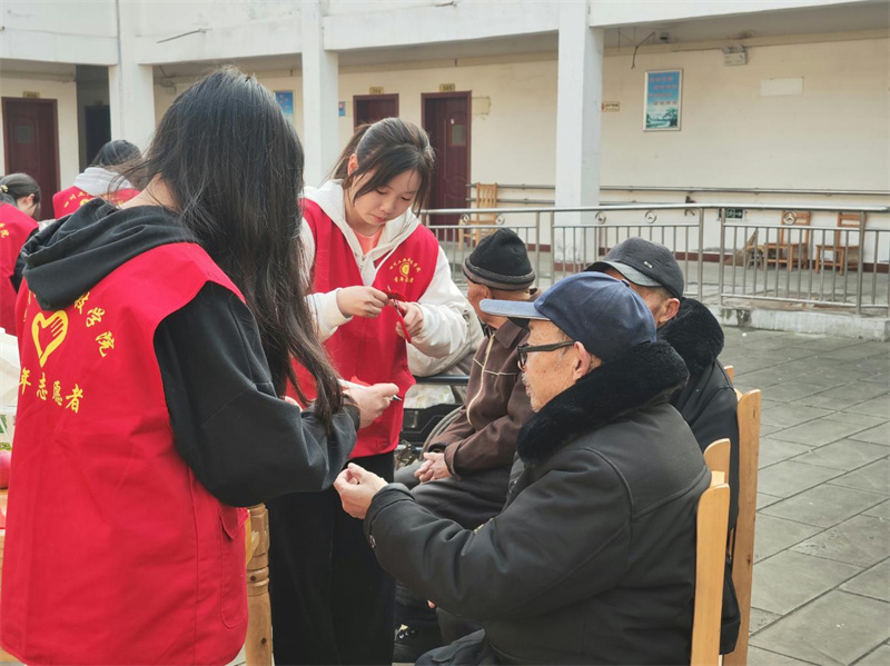 3月5日上午,为弘扬中华民族尊老敬老的传统美德,学校组织志愿者前往略坪镇敬老院慰问老人,贴心地为每一位老人分发了水果、面包、牛奶等食物,送上温暖,接着和老人们一同开展剪纸活动,为老人修剪指甲,测量血压,提醒他们日常生活中的注意事项,帮助他们收拾整理内务等,用朴实的真情让老人们体验到关心和关怀。最后,志愿者们以为老人们带来了《国家》手语操、《我站在草原望北京》《第一天》等舞蹈节目,活跃了气氛,展示了青年人的活力与精神,养老院里一片欢声笑语,暖意融融。
