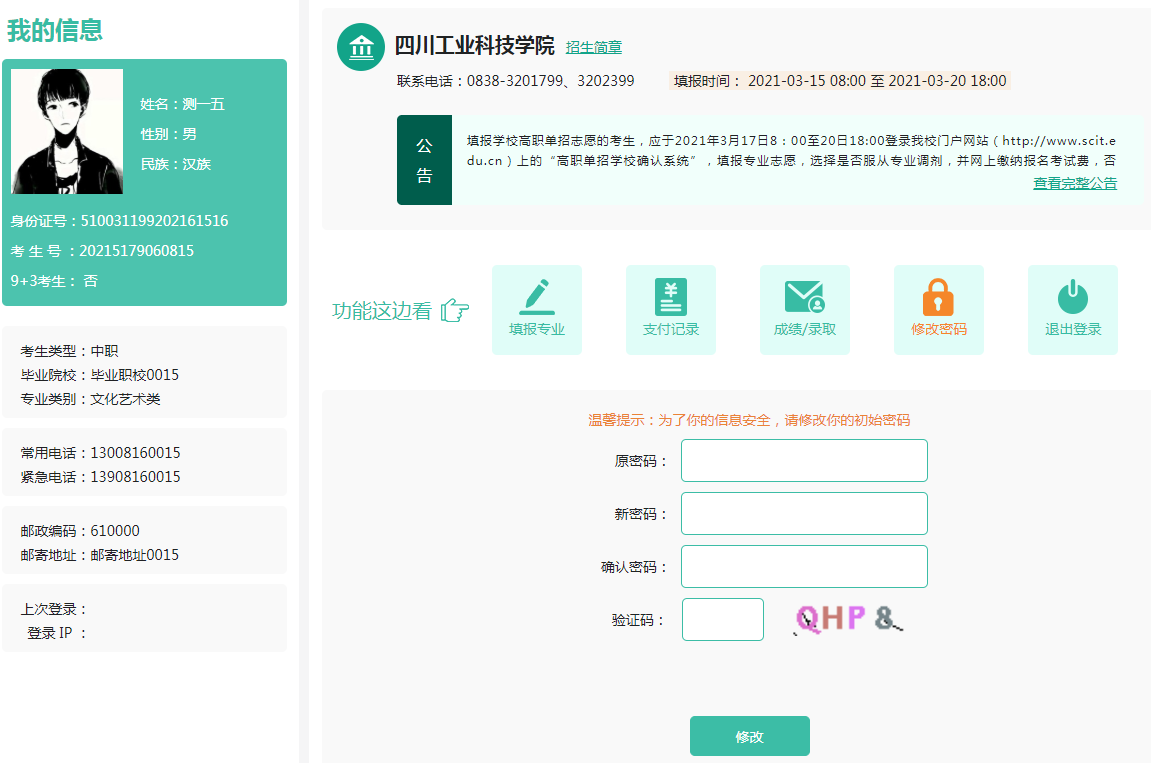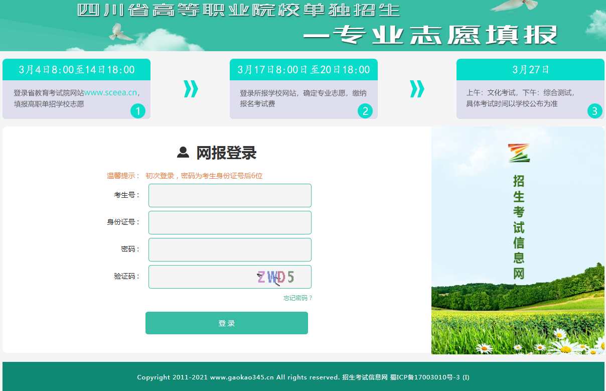 1.考生登陆网址:http://www.scit.edu.cn或http://gzdz.gaokao345.cn/。初始密码:考生身份证号后6位。
